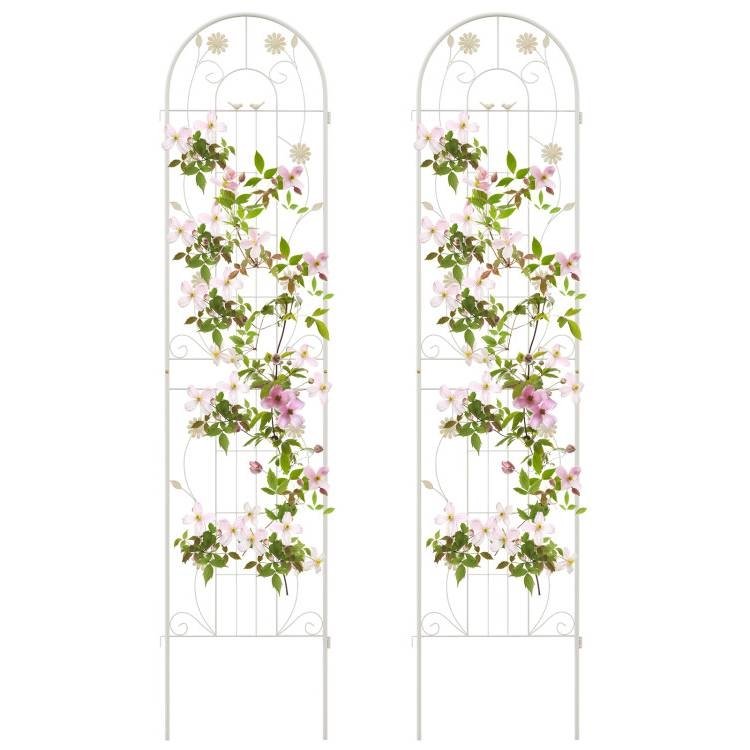 This 2 Pack - 7-ft Galvanized Steel Garden Trellis in White Metal Outdoor Finish is constructed of galvanized steel, ensuring unrivaled sturdiness and rust resistance to hold heavy plant for longer time. The trellis features 10.5", 11" long legs, allowing for effortless insertion into the ground, providing a stable foundation. With impressive heights of 71", the metal trellis offers an expansive area for your climbing plants and vines to reach new heights. By providing an abundance of vertical space, your plants can thrive as they eagerly stretch towards the sun's nourishing rays. Apart from being used as a plant support for climbing plants. The 2 pack trellis set can be combined with a garden fence, ensuring the protection and privacy of your cherished plants. Plus, you can connect 2 or more trellis in an A-shape frame for growing cucumbers or other climbing vegetables. Designed with enchanting birds, flowers and leaves, the tall garden fence will effortlessly add a touch of timeless elegance and retro charm to your garden, lawn, or yard. Moreover, you have the freedom to arrange more trellises to different layouts according to your unique requirements. Coming with complete components and a detailed instruction manual, the assembly process of the wire lattice grid panel is a breeze. Besides, the 2 pack fence trellises are designed with an effortlessly interlocked connector, allowing for quick setup.