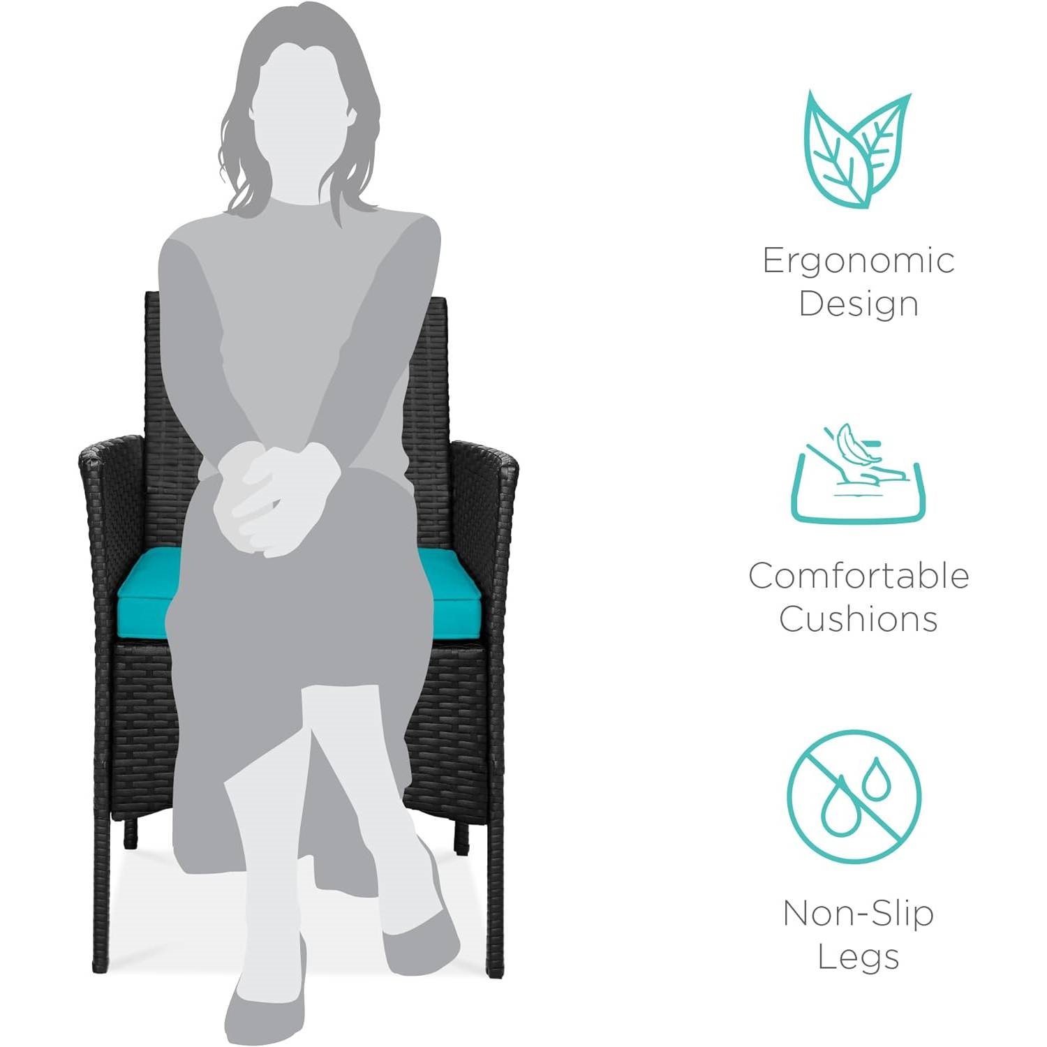 • 3-Piece Black PE Wicker Outdoor Dining Patio Furniture Set w/ Teal Blue Cushions
