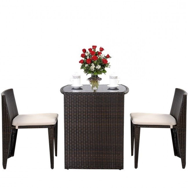 No space, no problem!! The 3 Piece Compact Espresso/White Wicker Patio Cushioned Outdoor Chair Table Set is perfect for any outdoor location, no matter the size. Made from PE Rattan Wicker, this patio set is made up of a wicker table with tempered glass top and comes with 2 chairs with soft white cushions. The sponge cushion design provides extra comfort. After finishing your breakfast, lunch, or dinner, you can put your chairs under the table perfectly, which greatly helps you save storage space.