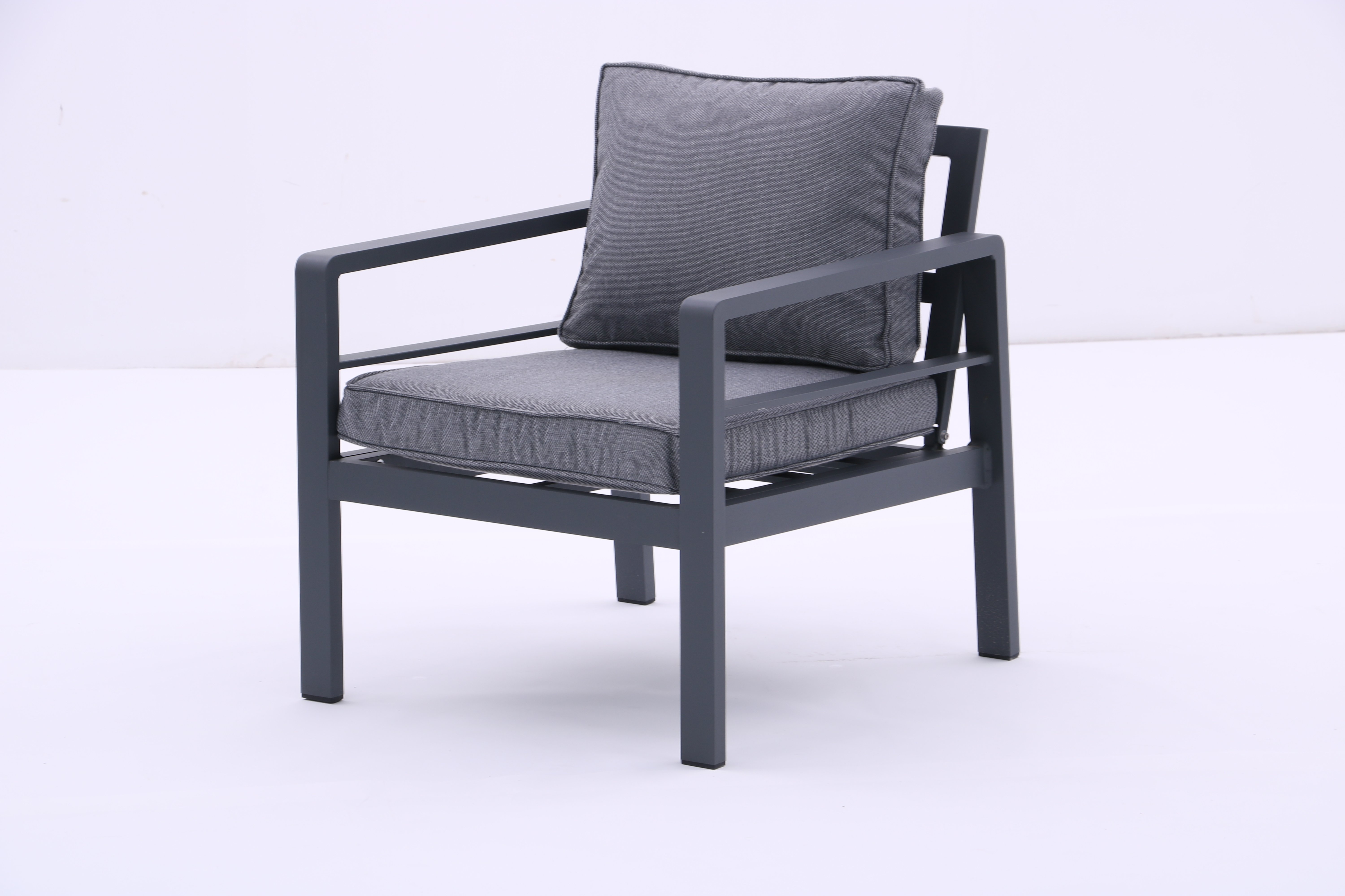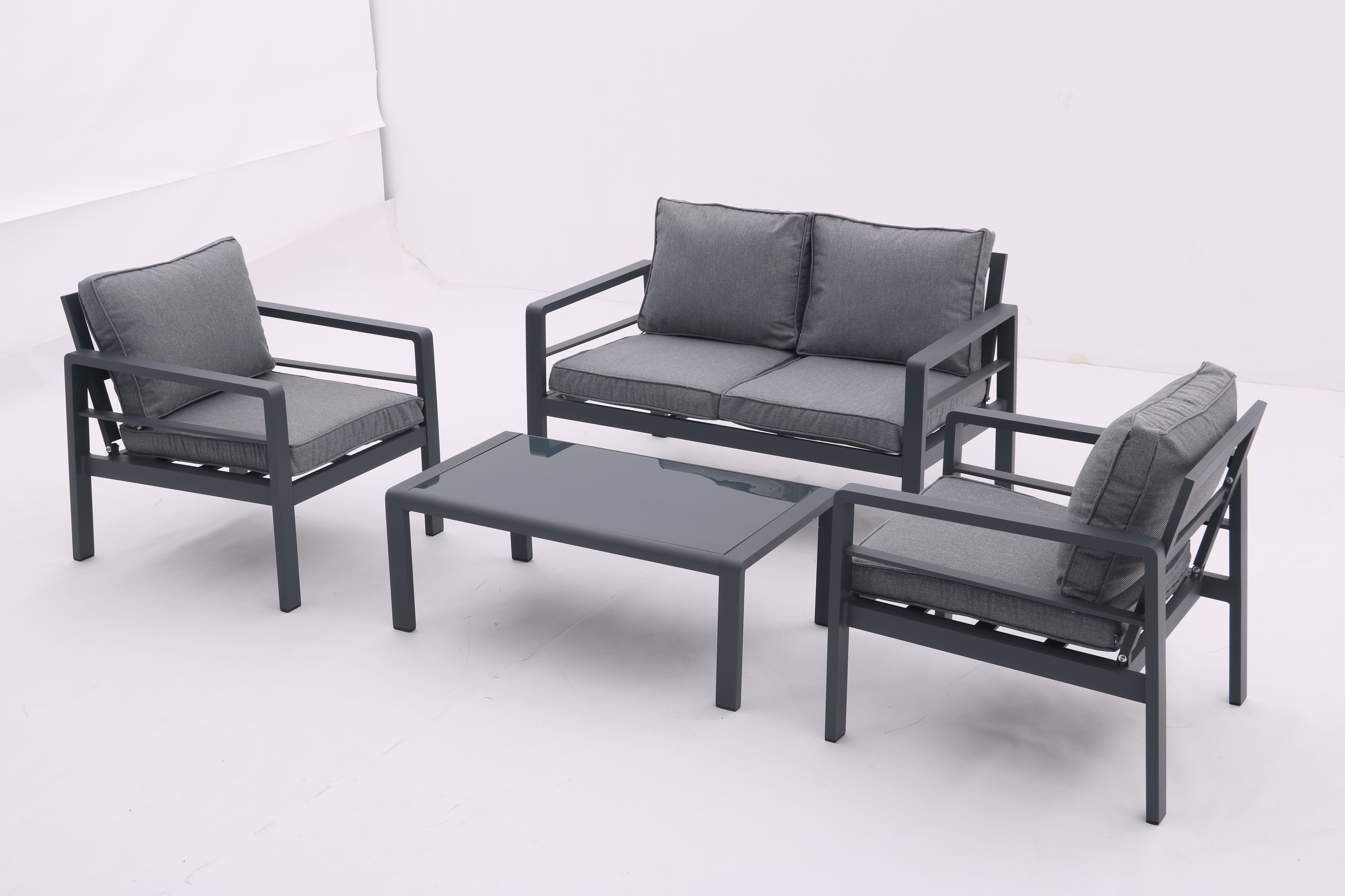 1.The 4-piece aluminum outdoor conversation set in clean-cut lines composed with a chic, minimalistic look could go well with any garden landscaping. Including 2 sectional sofas,2 single ones and 1 glass-topped table, this set can accommodate up to 4 people providing a cozy space enough for gathering and entertaining.