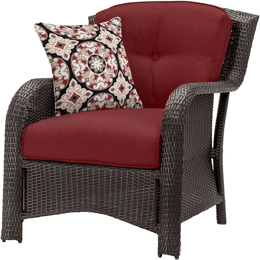 Relax in style with this Brown Resin Wicker 6-Piece Patio Furniture Lounge Set with Red Seat Cushions. This deep-seating set includes one loveseat, two armchairs, two ottomans, four accent pillows and a tempered glass-top coffee table with a shelf below for storage. Each item is carefully constructed with reinforced steel frames beneath 100% hand-woven resin strapping for ultimate all-weather durability. The thick foam cushions are wrapped in premium olefin fabric that is quick to dry and resists stains, water and UV harm. These cushions maintain their shape and are available in multiple color options that coordinate with any style. Enjoy more quality time with your loved ones as you sink into relaxed comfort of this outdoor lounge set.