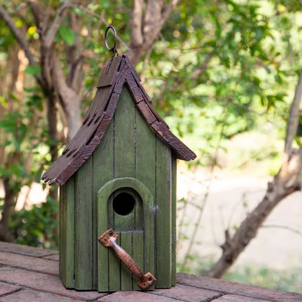 This Dark Green Wood Hanging Bird House for Outdoor Garden Deck Patio Tree would be a great addition to your garden. Sturdy wood construction with shingle-style roof; designed for outdoor use. A hanging ring is securely fastened to the metal roof and the back panel opens for easy clean-out each season. Hand painted then lightly sanded for a distressed finish. Delightful garden accessory for adding style to your patio or garden area. With this birdhouse, you are not only enhancing your garden but also offering your feathered friends a cozy home.