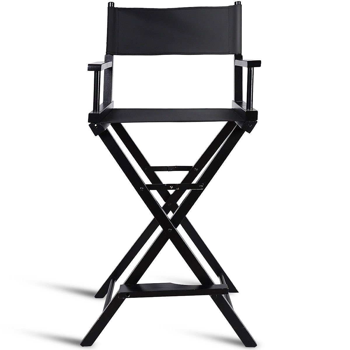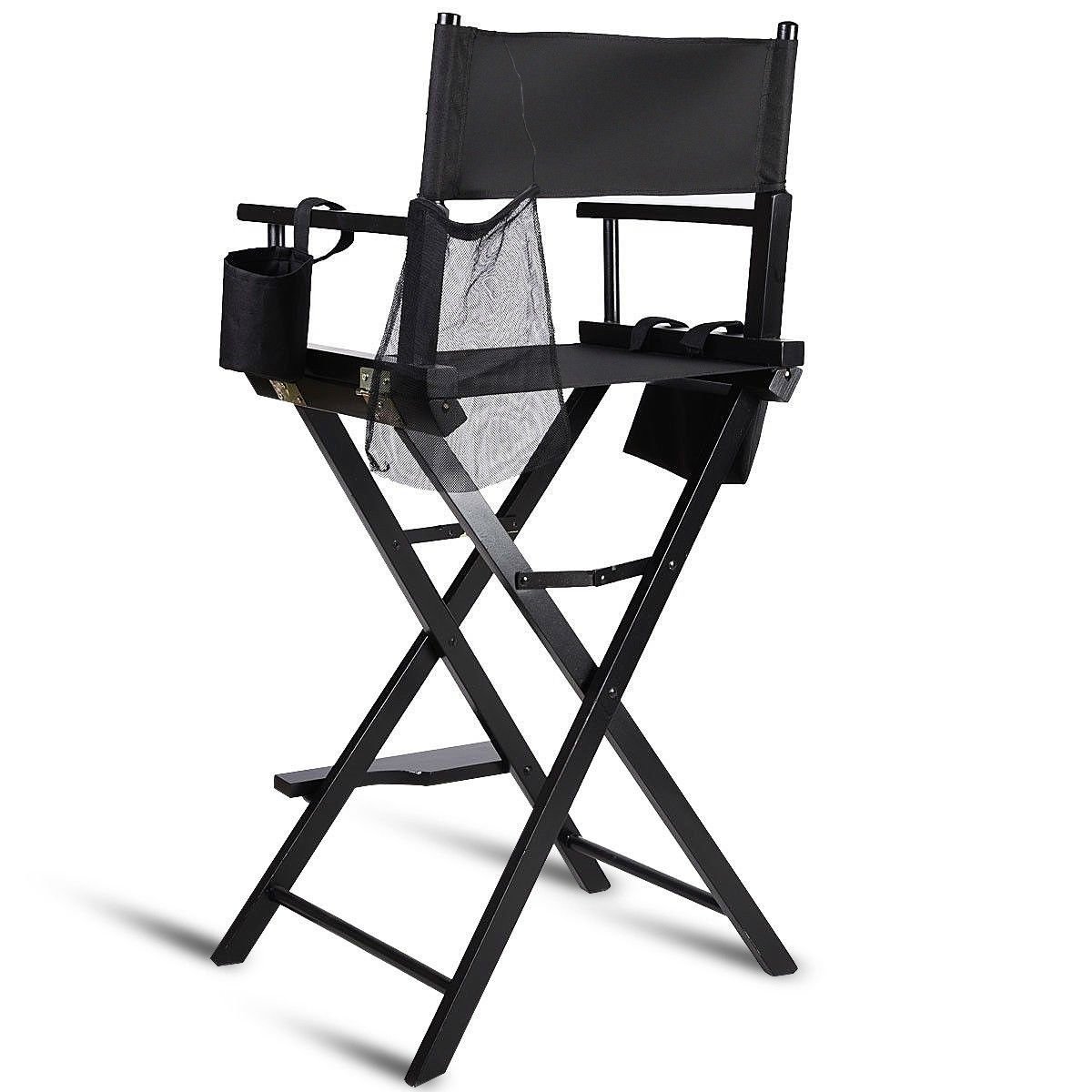 This Outdoor Patio Folding Directors Chair with Foot Rest and Drink Holder in Black is ideal for professional makeup artists, motion picture directors, actors or staffs. This chair designed with a sturdy solid hardwood frame offers stability and durability. It is foldable and lightweight, which makes the chair flexible and easy to transport. The only assembly-needed is the foot rest. The chair with black color is modern and classic, will never go out of style. The chair comes with a water bottle holder, two small storage pouches and one large net pouch, where you could have your makeup, accessories and personal items well ordered. The chair with solid hardwood frame meets almost all of your expectation for a makeup artist chair!