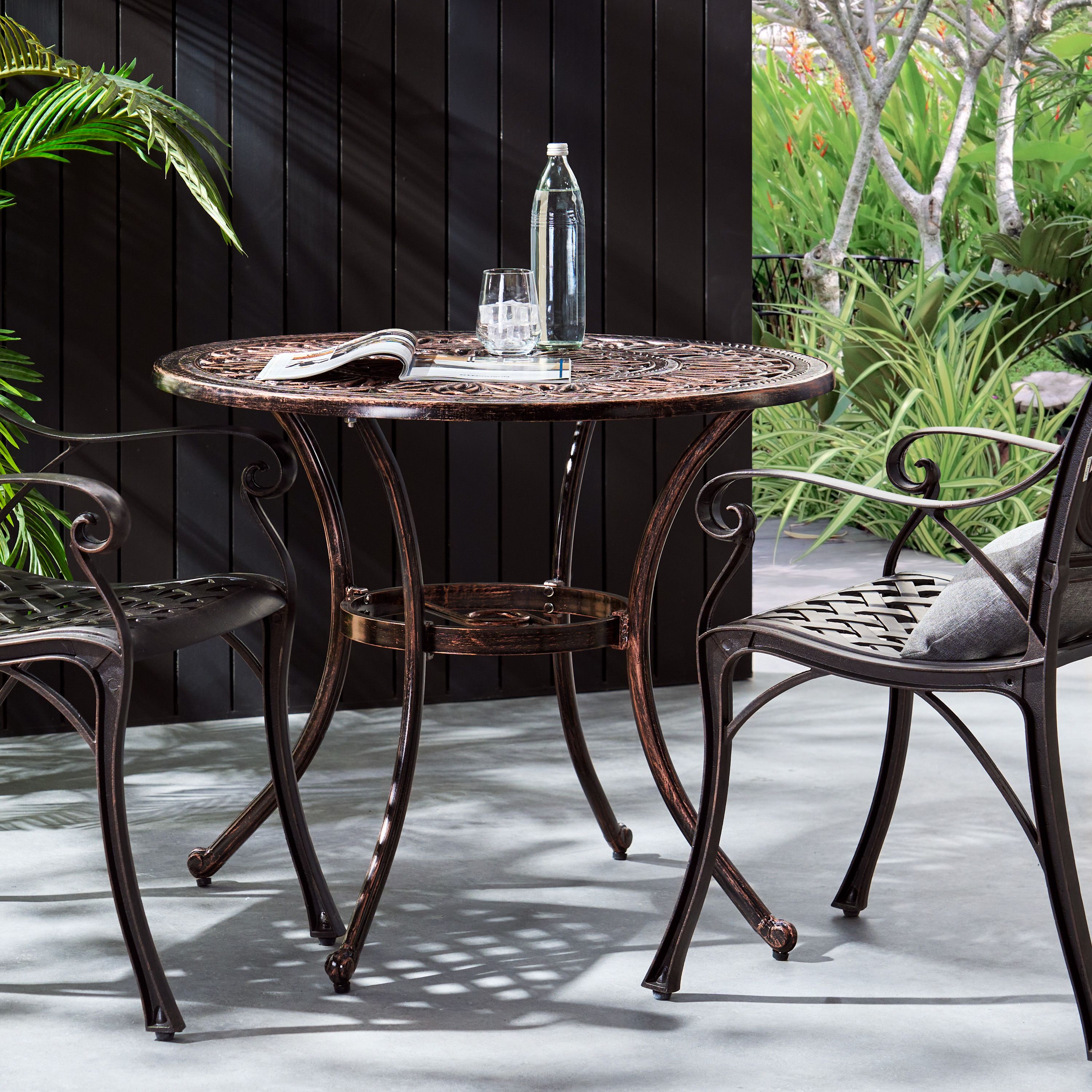 This cast-iron aluminum dining table's organic curves and elegantly cut-out design are too beautiful to cover up with a tablecloth. Treated with a powder coating specially formulated to ward off the possibility of rust and tarnish, this selection is tough enough to last, providing the perfect place to make memories for years to come.