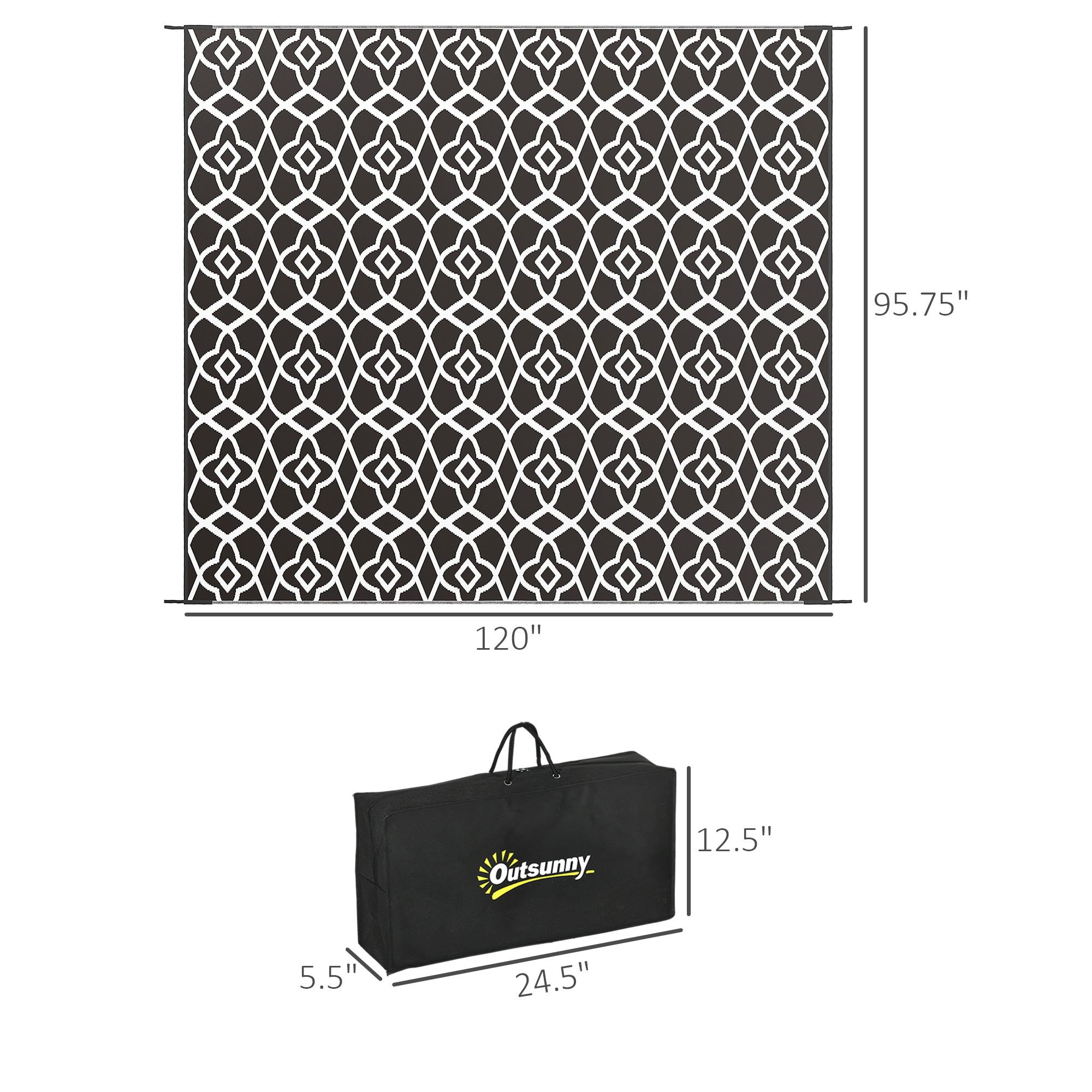 Camp on a carpet with Outsunny. This porch rug is designed to handle dirt. Outdoor-ready, our rug really cleans up fast; sweep, spray, wipe, or wave it; its powerful polypropylene fibers stay dry and don't saturate. Keep an outdoor rug in the camper, RV, or car; it's excellent for camping, beach trips, patio picnics, or anywhere outside. The color is reversible, meaning you can flip our plastic rug over for a fresh side or style. Upholster the outdoors with Outsunny.