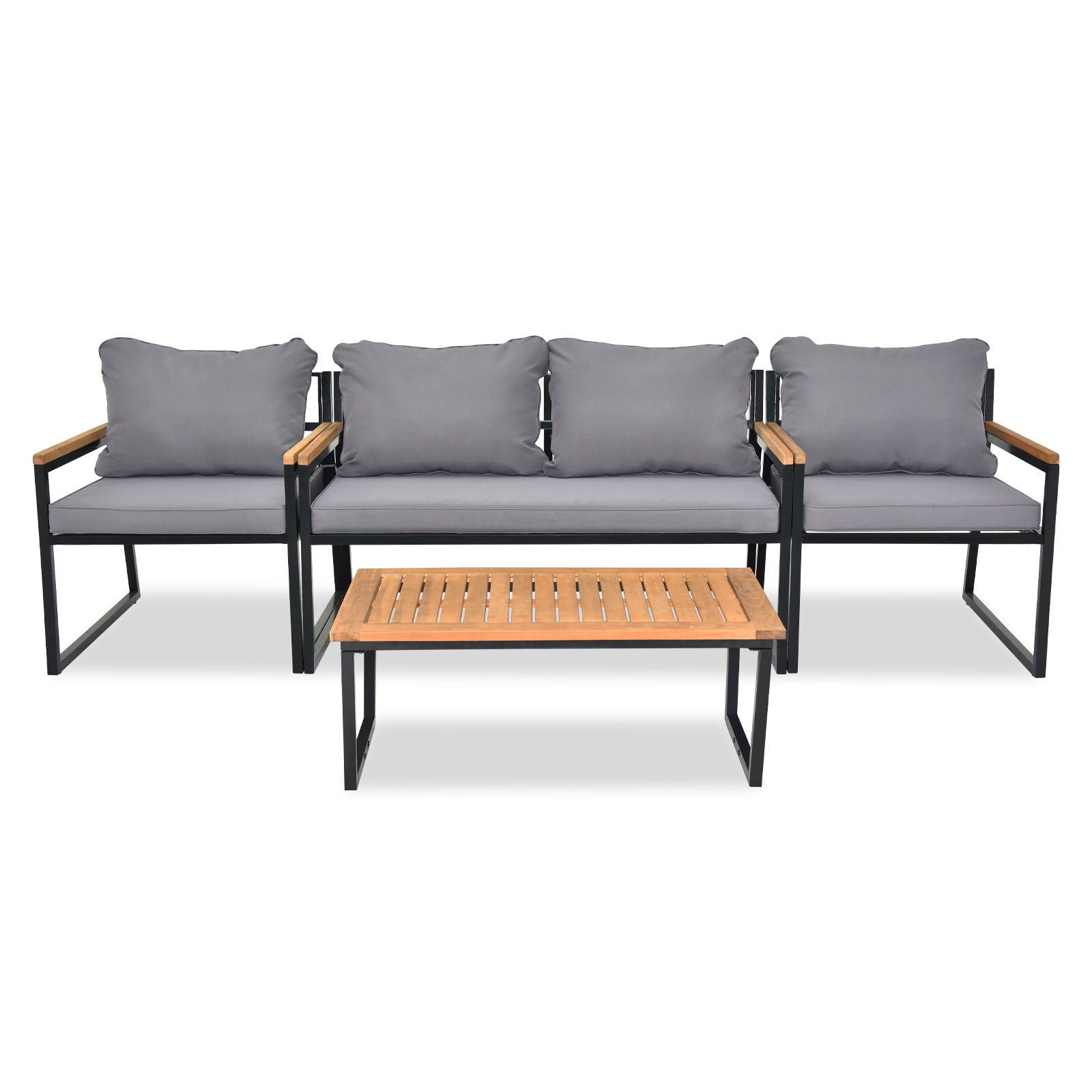 Elevate your outdoor lounging experience with our 4 Piece Outdoor Patio Lounge Conversation Set. This set combines the modern durability of a metal frame with the natural elegance of acacia wood, creating a stylish and comfortable outdoor living space. Perfect for backyard gatherings, balcony relaxation, or deck enjoyment, this set includes spacious seating with soft, thick cushions for ultimate comfort and a solid wood tabletop for convenience and style. The water-repellent cushion covers and easy-to-clean tabletop ensure maintenance is a breeze, making this set a practical choice for any outdoor setting.