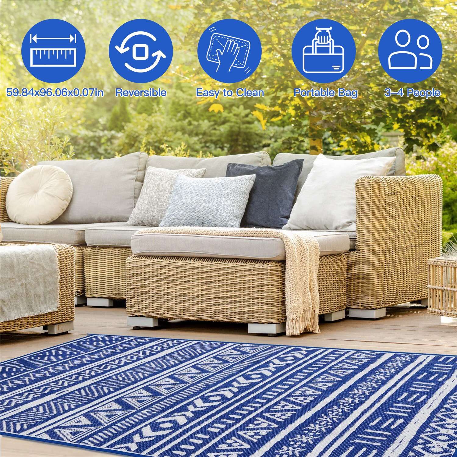 *Reversible Rug*:This 4.98x8FT mat is designed with blue and white geometric patterns on both sides,you can flip over to get a new one if one side is messy. Bohemian style makes it also a stylish decoration on floor,a large,affordable and practical outdoor or indoor rug.